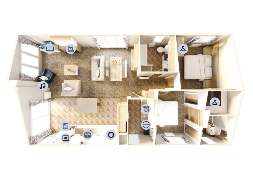 With a fresh colour scheme, the Pinehurst’s well thought-out design makes it popular with those looking for the perfect weekend bolthole. This open-plan lodge is ideal for catching up with loved ones and visitors. The lodge boasts king-size beds in both the master and second bedroom, a three piece suite in the living area, and a large kitchen complete with an island. There really is room for everyone.